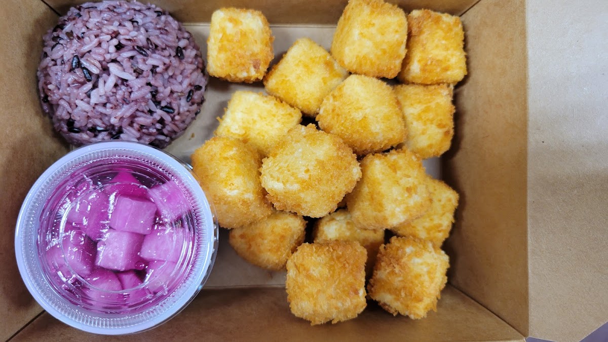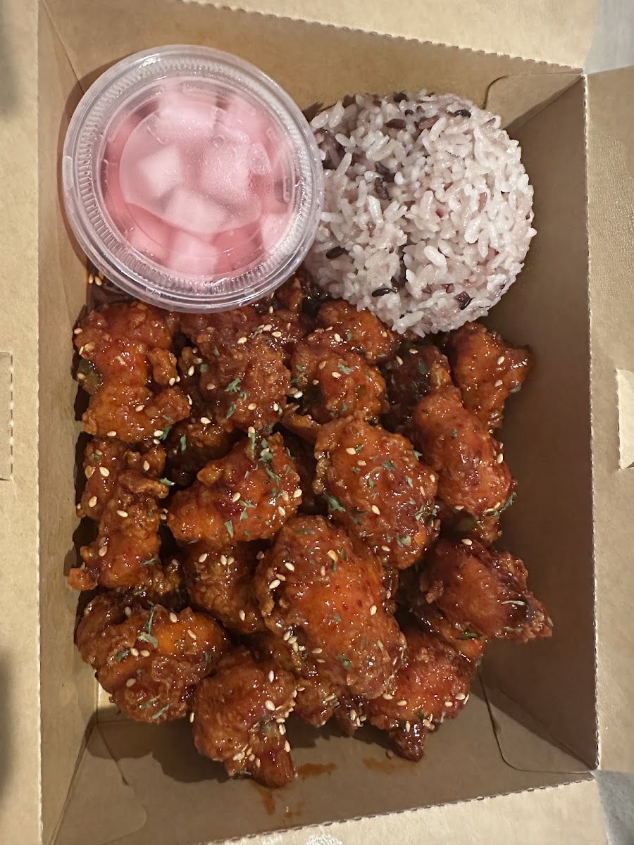 This place is so good. I come a minimum of 2-3 times a month. I get the prime sweet hot spicy chicken meal. It comes with crispy chicken (that actually stays crispy when you get it to-go or have leftovers!) sauced in a fantastic sweet and spicy sauce, a side of the “prime” sauce (which is like a garlic ranch), delicious picked daikon and purple rice. It’s always packaged so beautifully and the staff are all very nice, you can tell they care about the product they serve.